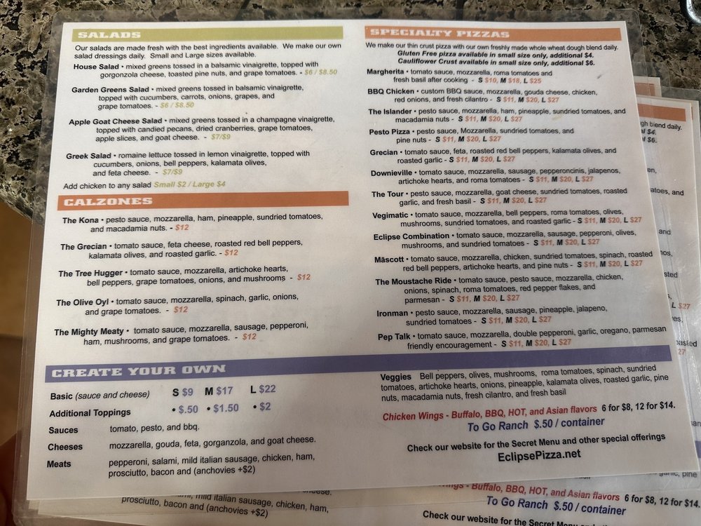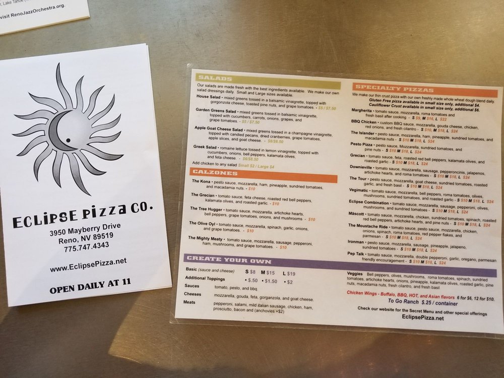 Introducing Eclipse Pizza Co., a pizza joint located in Reno, NV. With a diverse menu that includes salads like the Apple Goat Cheese Salad and Garden Greens Salad, specialty pizzas like BBQ Chicken Pizza and Grecian Pizza, and the option to create your own pizza, Eclipse offers something for every pizza lover. Customers rave about the extensive toppings selection and the quality of the ingredients used. The atmosphere is casual yet classy, perfect for a lunch or dinner with friends or family. The staff is known for their friendliness and excellent service. While wait times can be long during peak hours, the delicious pizza and cozy ambiance make it worth the wait. Eclipse Pizza Co. stands out for its tasty food, welcoming atmosphere, and great value for money, making it a must-try spot in Reno.